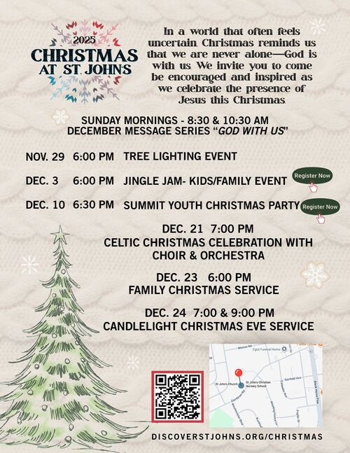 In the hustle and bustle of the season don’t forget to slow down and celebrate the reason for the season with us at St. John's Church. This year, we’re planning our popular Tree Lighting event, a special Christmas concert, Jingle Jam for kids & families, plus 3 Christmas Eve services that are sure to help you find new meaning and joy in the season. We hope to see you soon!